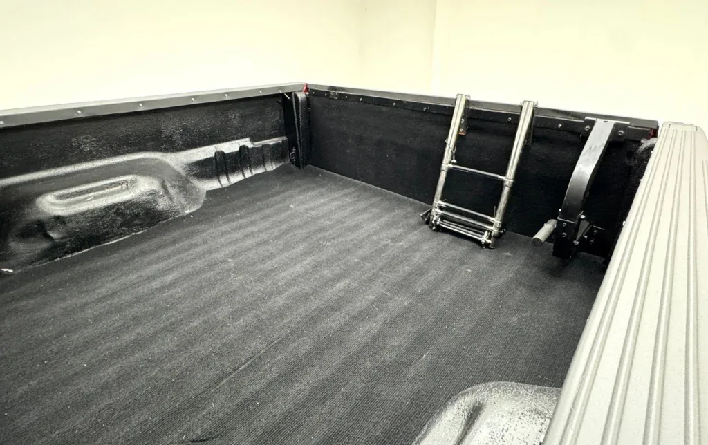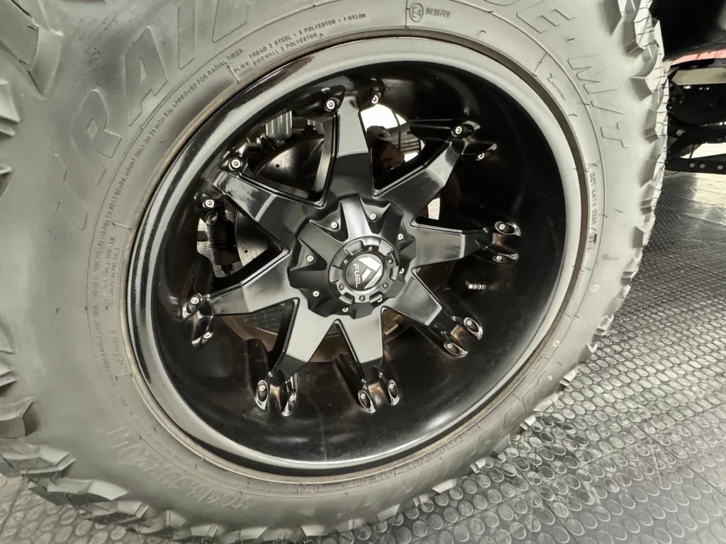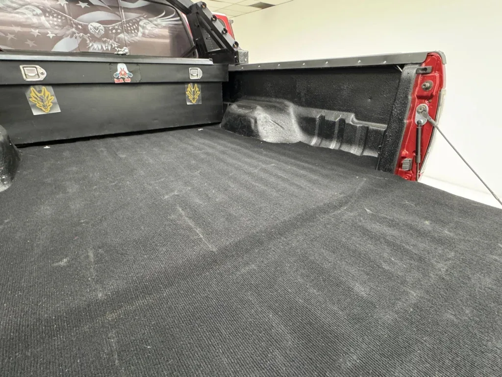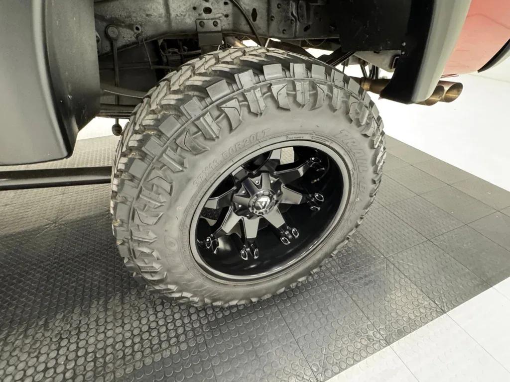 Toreador Red jest równoważony wieloma czarnymi elementami, w tym zderzakami, nitowanymi nadkolami, matowym paskiem na masce, daszkiem i tylnym bagażnikiem. Między tymi nadkolami a 20-calowymi kołami Fuel, również czarnymi i wyposażonymi w opony terenowe z oceną LT, jest imponująca przerwa. Z przodu, między czerwonymi hakami znajduje się orurowanie, które otacza parę świateł przeciwmgielnych LED, wszystko pod siatkową osłoną chłodnicy, wlotem powietrza na masce, szerokimi lusterkami bocznymi i przyciemnianymi światłami kabiny. Z tyłu, pod tylną klapą znajduje się solidny hak holowniczy, flankowany tylnymi światłami w stylu Altezza, a rurowy tylny bagażnik mieści jeszcze więcej świateł i otacza patriotyczną grafikę amerykańskiego orła, która zakrywa tylną szybę, z której widać wykładzinę i czystą skrzynię ładunkową. Lakier i dodatki są w świetnym stanie, a niedoskonałości ograniczają się do lekko krzywych świateł obrysowych z przodu i uszkodzonego i luźnego wlotu powietrza na masce.