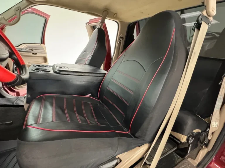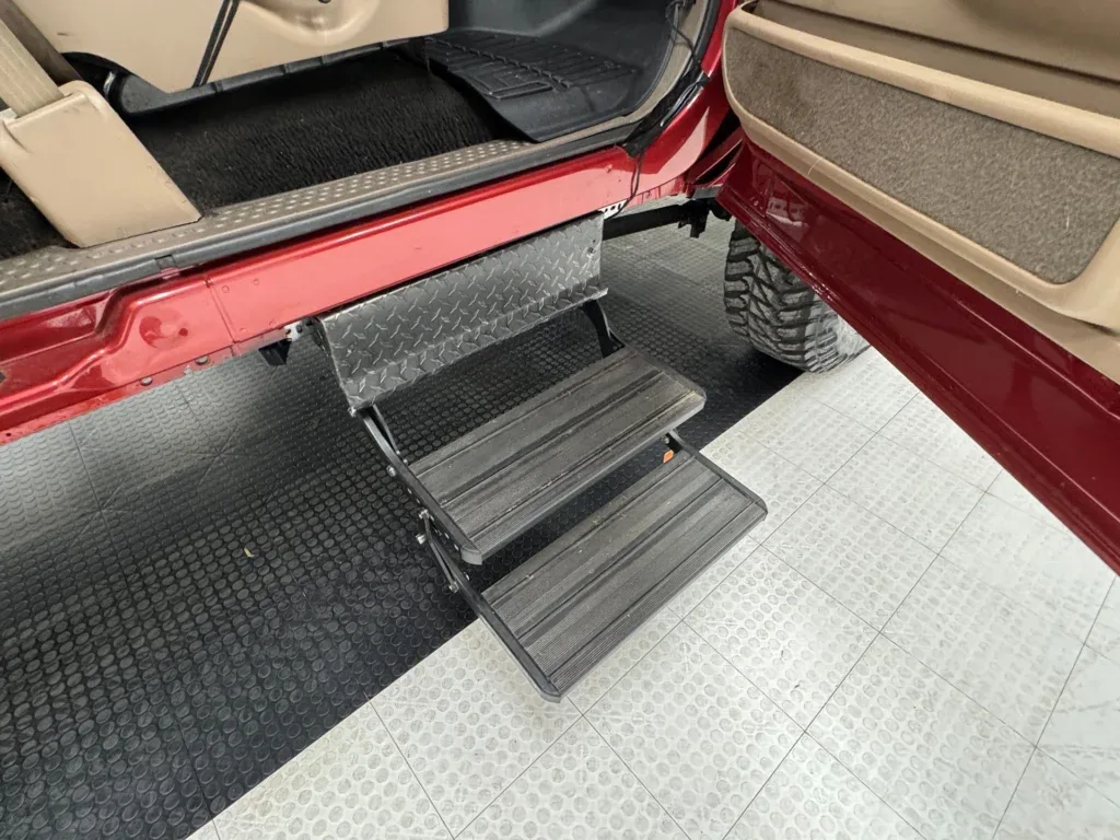 Po otwarciu drzwi schody automatycznie wsuwają się na miejsce, dzięki czemu można dostosować wysokość, podczas gdy siedzenia i brązowe plastikowe panele drzwi we wszystkich czterech drzwiach prezentują się czysto, z brakującą osłoną głośnika na jednym i wgnieceniem w drugim, ale poza tym nienaruszone. Wejście prowadzi do siedzeń z tkaniny kubełkowej, teraz w pełni pokrytych z przodu czarnymi elementami z rynku wtórnego, a tylna kanapa jest podobnie potraktowana. Nasza kierownica również ma czarno-czerwoną osłonę i prowadzi do podstawowego zestawu wskaźników, podczas gdy w centrum znajduje się ekran obsługujący odtwarzacz AM/FM/CD nad potrójnym zestawem pokręteł panelu klimatyzacji. Konsola środkowa pokazuje trochę patyny, podobnie jak podsufitka powyżej. Czarny dywan zalewa podłogę i jest chroniony przez pokrycia WeatherTech.